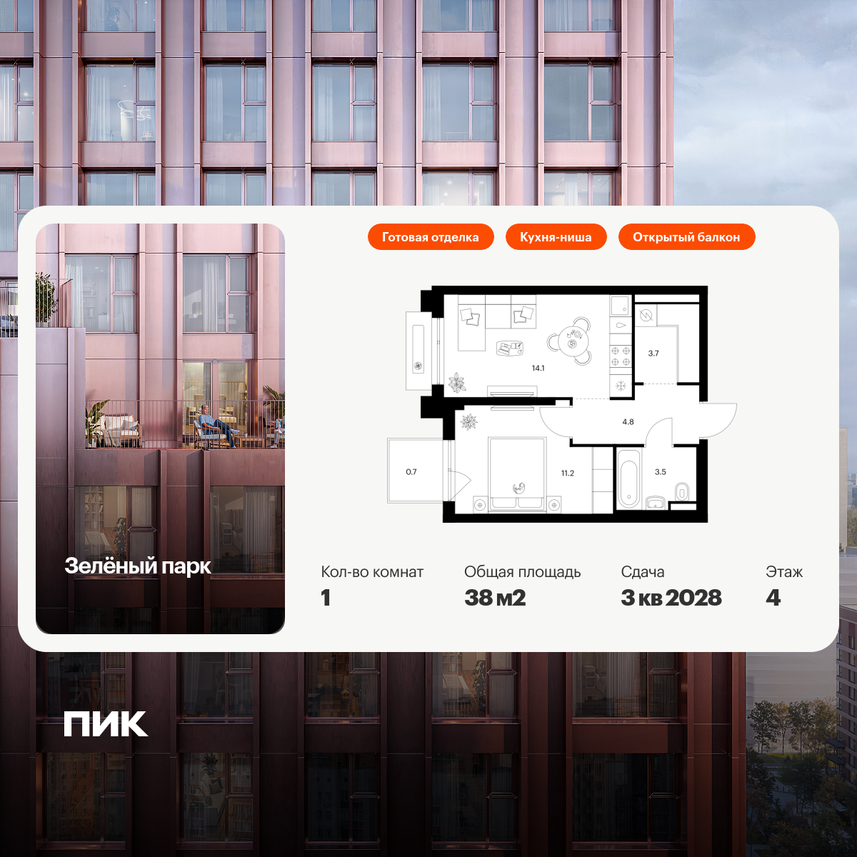 Продаётся 1-комн.квартира площадью 38.00 кв.м на 4 этаже 13 этажного дома (Корпус 5.3, секция 3) проекта ПИК Зелёный парк. Светлый просторный подъезд на уровне земли, функциональная планировка, большие окна, с отделкой.