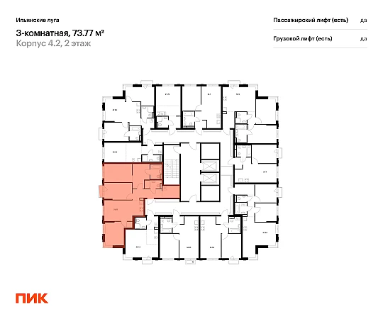 Продаётся 3-комн.квартира площадью 73.77 кв.м на 2 этаже 9 этажного дома (Корпус 4.2, секция 1) проекта ПИК Ильинские луга. Светлый просторный подъезд на уровне земли, функциональная планировка, большие окна, с отделкой.