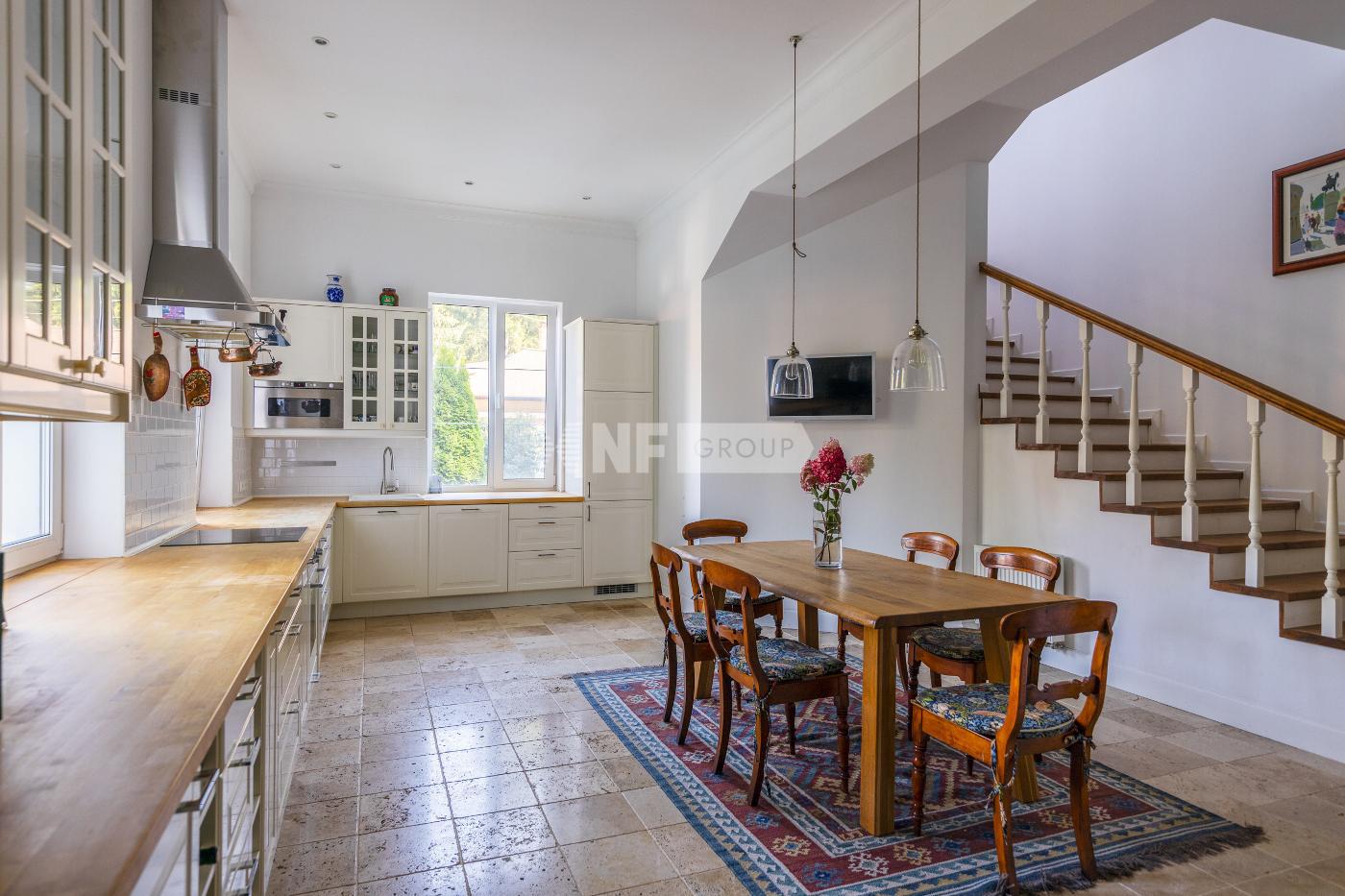 - уютная гостиная с большим камином и антикварным английским деревянным порталом, современная кухня, объединённая с гостиной, отапливаемый зимний сад и просторная летняя терраса с летней мебелью и выходом в сад, ванная комната с сауной, бочкой и гостевым су.