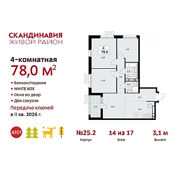 Продается 3-к квартира площадью 61.6 кв.м. на 26-м этаже 29 этажного дома в ЖК "Very" от ГК ОСНОВА.