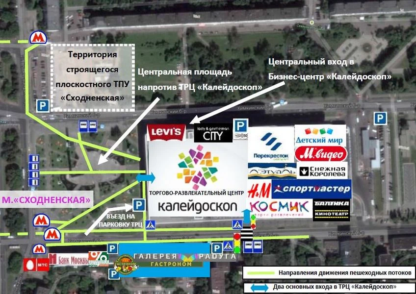 Большой густонаселённый жилой массив с высокой плотностью застройки. Галерея «РАДУГА» отлично видна со всех выходов из ст.м. «Сходненская»