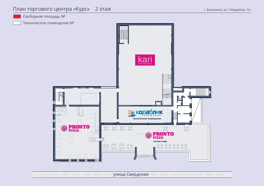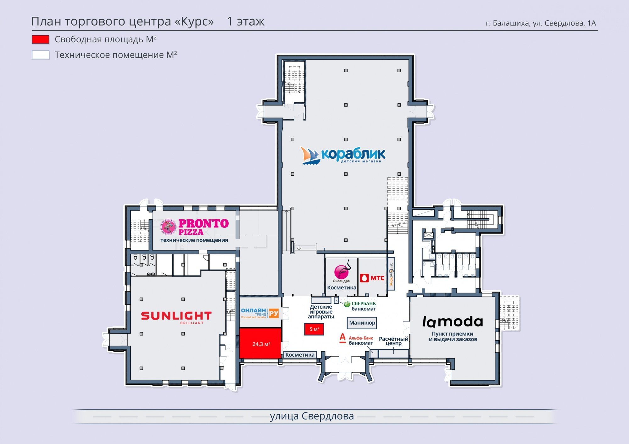 Около 10 магазинов: детский магазин «Кораблик», итальянское кафе «PRONTO PIZZA», ювелирный салон «Sunlight», обувной магазин «KARI», пункт приемки и выдачи заказов «Lamoda», салон связи «МТС», косметика «Океандра», пункт выдачи «ОНЛАЙНТРЕЙД», пункт выдачи «Pick Point» и др.