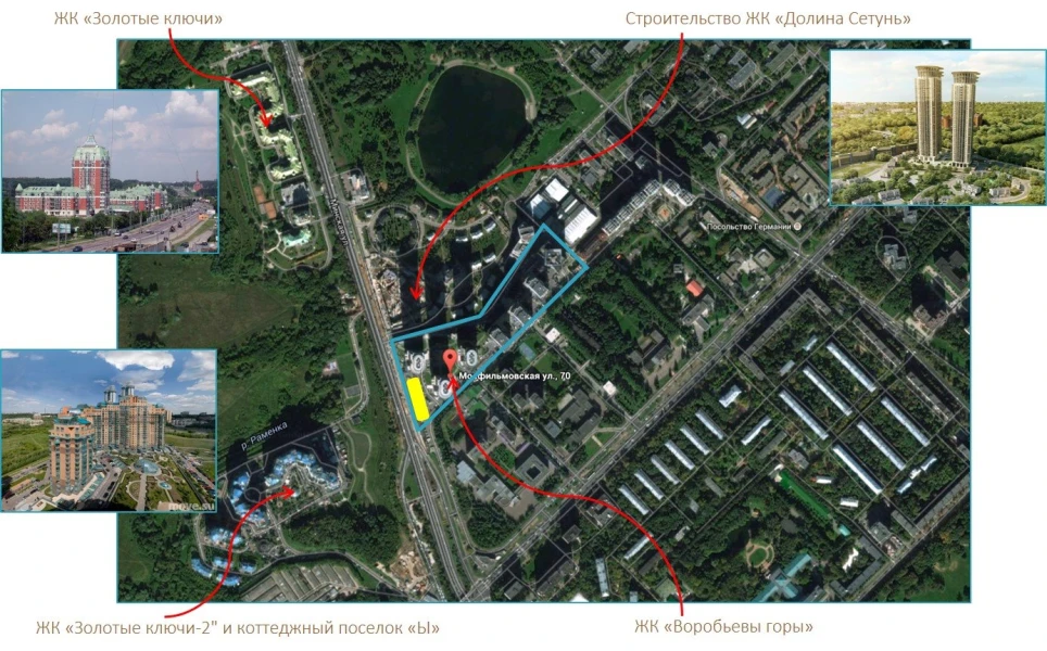 Район, где располагается торгово-развлекательный центр, изобилует девелоперской активностью. В непосредственной близости от него поднимаются три новых жилых комплекса: ЖК «Долина Сетунь», ЖК «Снегири Эко» и МФК «Штаб-квартира на Мосфильмовской». Этот район славится высоким уровнем жизни: он уже давно становится домом для состоятельных людей, а стоимость квартир здесь стартует от 30 миллионов рублей и значительно превышает эту сумму.
