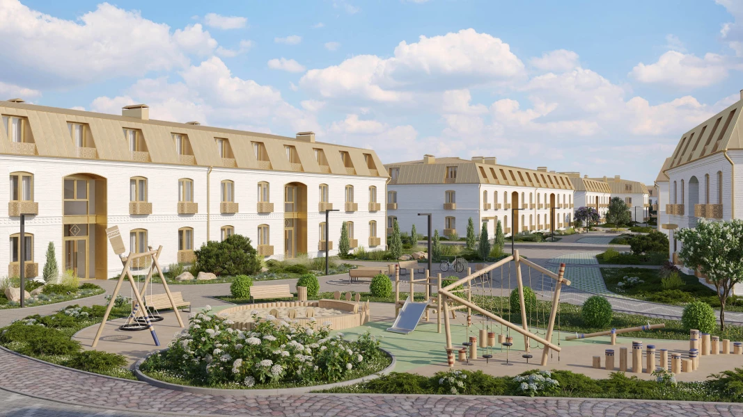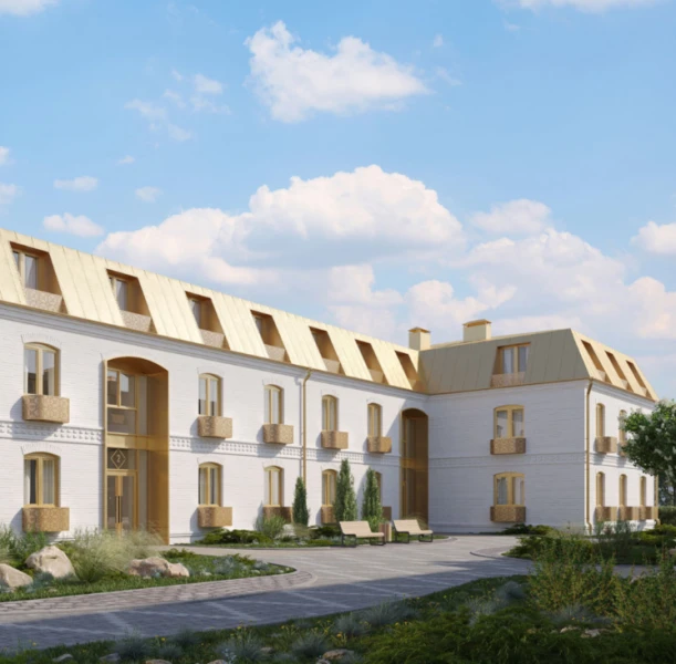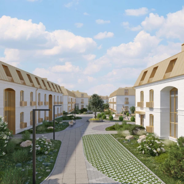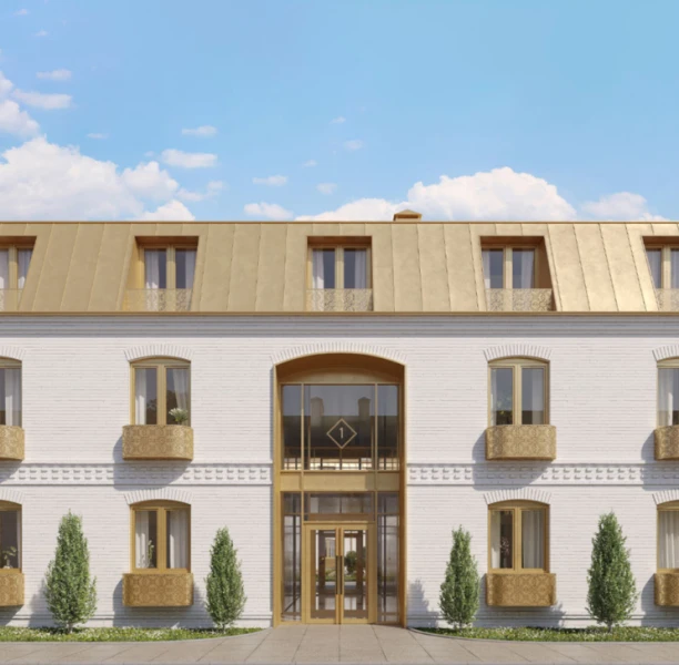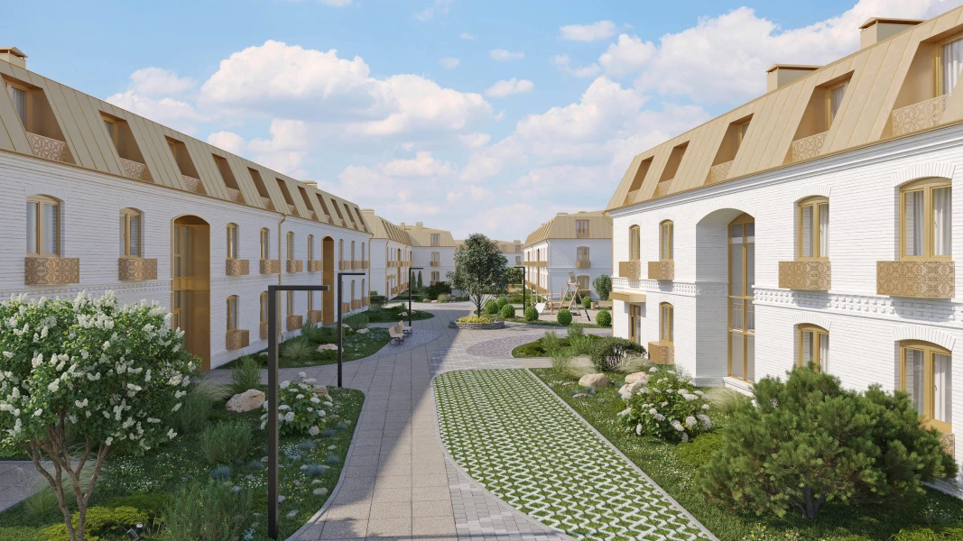 Современный жилой комплекс гармонично вписывается в историческую архитектуру города благодаря эффектному сочетанию белых фасадов домов с элементами отделки в цвете благородного матового золота и общей стилистике палат храмового комплекса, отсылающей к величественным постройкам Лавры.