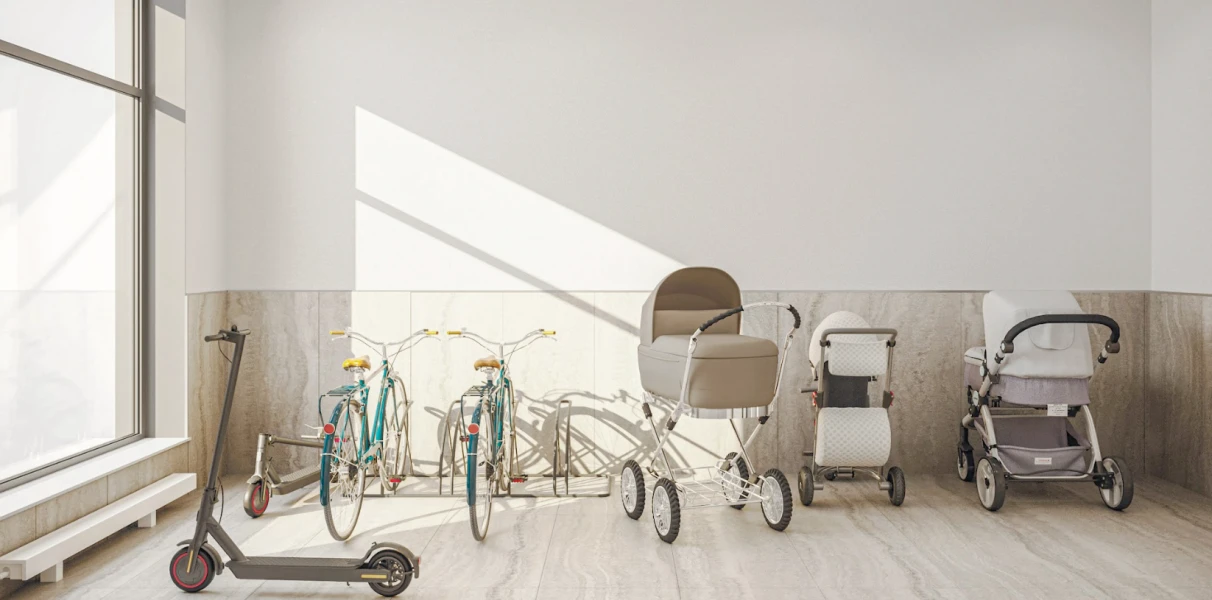 Специально для родителей с колясками, детей на велосипедах и самокатах, маломобильных жителей предусмотрена безбарьерная среда. Заходить в подъезды домов легко — никаких ступеней и порогов. Весь «транспорт» можно оставить в специальных комнатах для хранения на первом этаже и не нести домой.