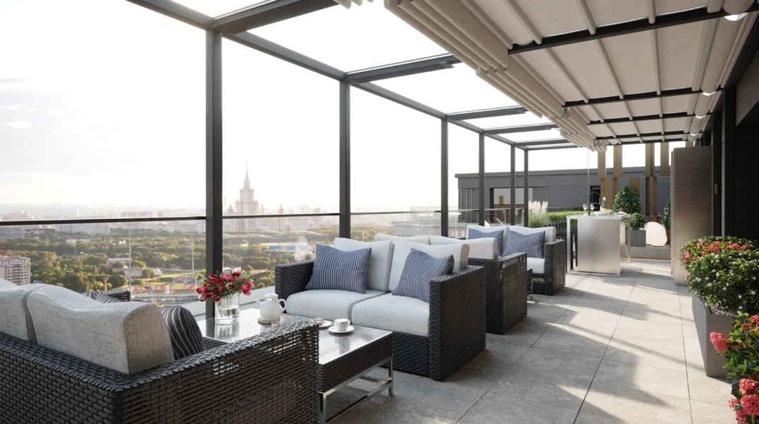 Потрясающие виды города открываются с панорамной террасы клубного дома CULT, а комфортабельная лаунж-зона с BBQ и шезлонгами располагает к отдыху в любое время дня.