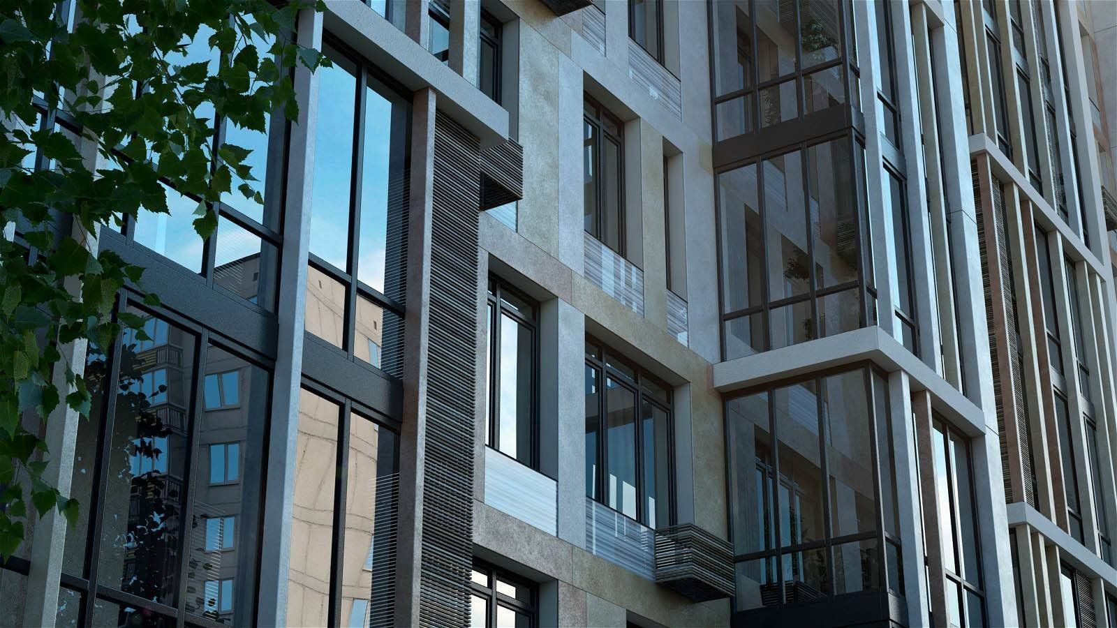 Здание выполнено по монолитной технологии с использованием стеклофибробетона светло-серых оттенков, что придаёт фасаду современный и строгий облик. Высота потолков составляет 2,85 метра, обеспечивая ощущение простора и свободы. Апартаменты сдаются без отделки, предоставляя владельцам возможность реализовать индивидуальные дизайнерские решения.