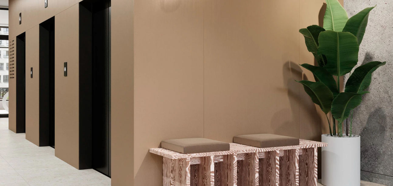 В стильной лаундж-зоне в лобби приятно встретить курьера и забрать заказ. Пространства созданы из современных текстур и материалов — воздушные и светлые, с терракотовыми цветовыми акцентами, черными деталями и живыми растениями.
