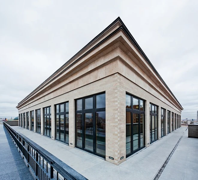 Это строение наделено романтикой французских панорамных окон, обходной галереей и элегантными эркерами. Примечательна и отделка общих зон, выполненная с заботой о каждой детали. Боковые и задние фасады украшены вентилируемым фасадом, выполненным из мраморизованного кирпича Franken-Schotter, который гармонично интегрирован в подсистему Halfen. Остекление также не отстает от современных тенденций: использование продуманных дерево-алюминиевых конструкций окон, среди которых есть и специальные противопожарные и пулестойкие решения от компании GekaExklusiv.