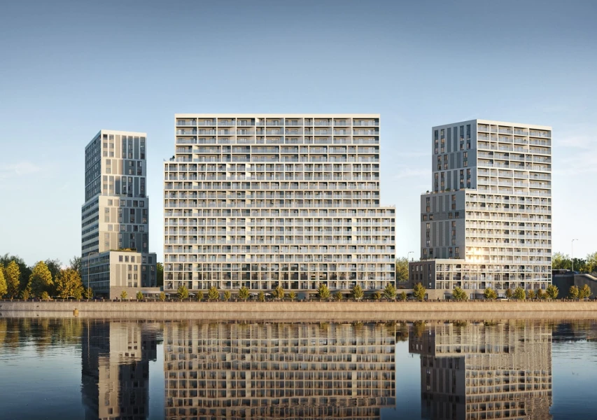 Forst – это северный морской пейзаж, пересказанный архитектурным языком. Монументальные корпуса вырастают над Москвой-рекой, цитируя утёсы норвежских фьордов. Клинкерные фасады воспроизводят расцветку прибрежных гор: чередующиеся тёмно- и светло-серые этажи создают эффект слоистой скальной породы.