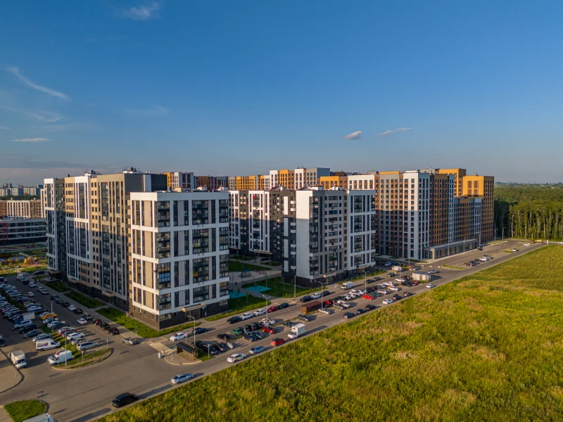 «Эко Бунино» — жилой комплекс из 19 корпусов разной высотности. Такой архитектурный ансамбль напоминает маленький город. На фасадах играют природные оттенки: от снежно-белого до терракотового, охры и темно-коричневого. Сочетание панелей с деревянной текстурой и плиткой под кирпич гармонично смотрится с ярким лесом на фоне. А акцентов домам добавляют прямоугольные арки входных групп.