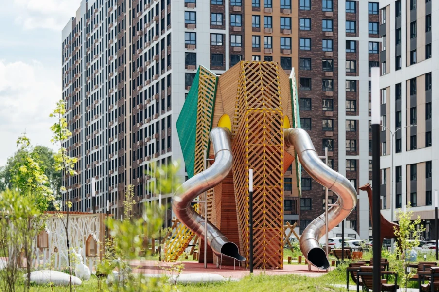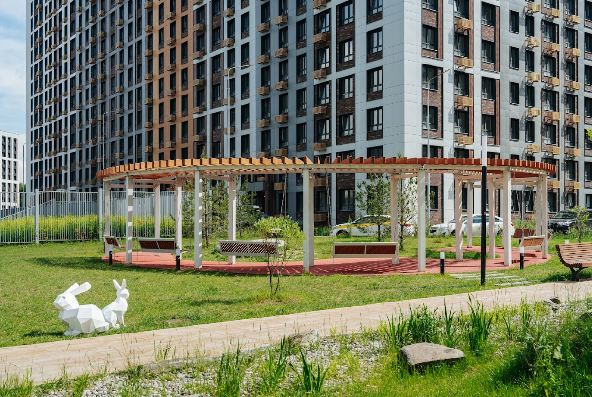 Во дворе каждый житель квартала найдет для себя любимое место. Влюбленных в чтение укроют от всех живые изгороди, поклонникам фитнеса, йоги или настольного тенниса наверняка понравится на спортивных площадках. А внимание детей привлекут 2 плейхаба с игровыми зонами. Здесь можно взлетать к облакам на качелях под навесами-перголами, с восторгом съезжать с горки в виде слона и знакомиться с милыми скульптурами-кроликами, которые притаились возле тропинок.