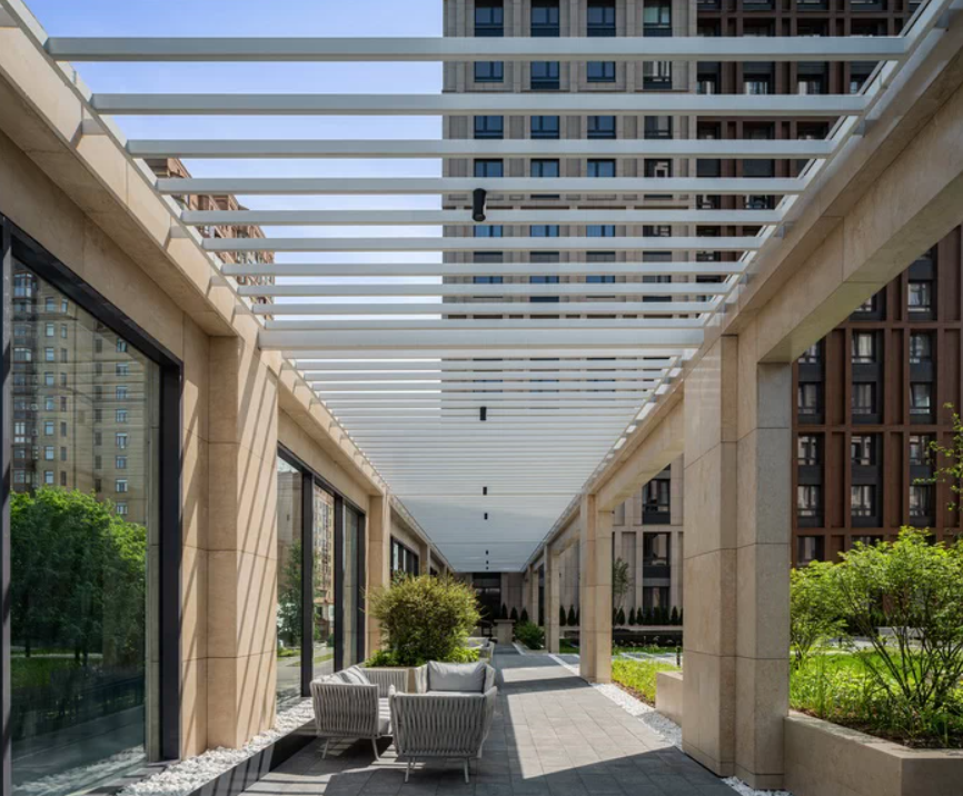 Над концепцией работала команда архитектурного бюро APEX, известного своими масштабными проектами по созданию городской среды. Фасады первых этажей облицованы натуральным камнем, в то время как верхние обрамлены элегантным крупноформатным керамогранитом. Сочетание тёмно-коричневых и светло-серых оттенков создает выразительную композицию, а дополнительное украшение фасада металлическими решетками с дизайнерской перфорацией подчеркивает гармонию и стиль.