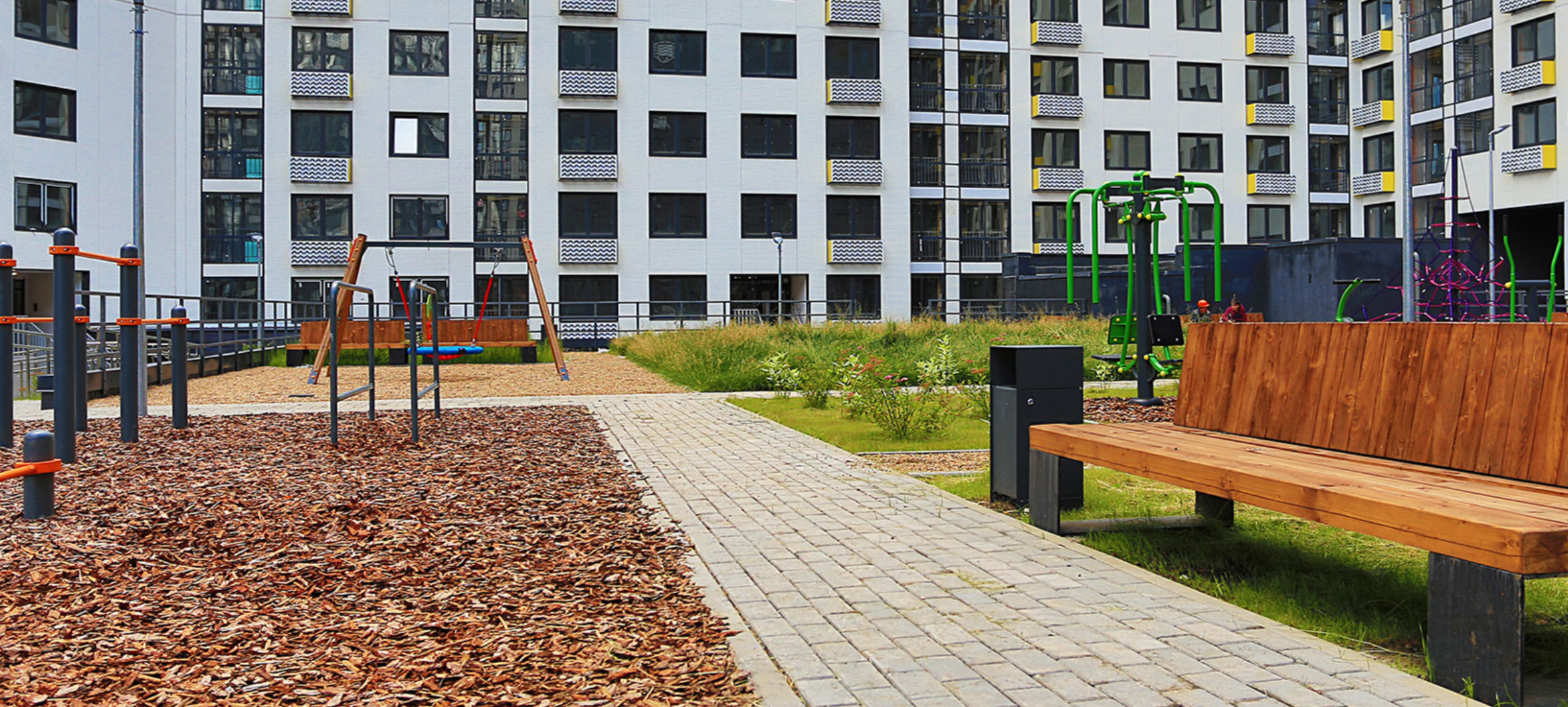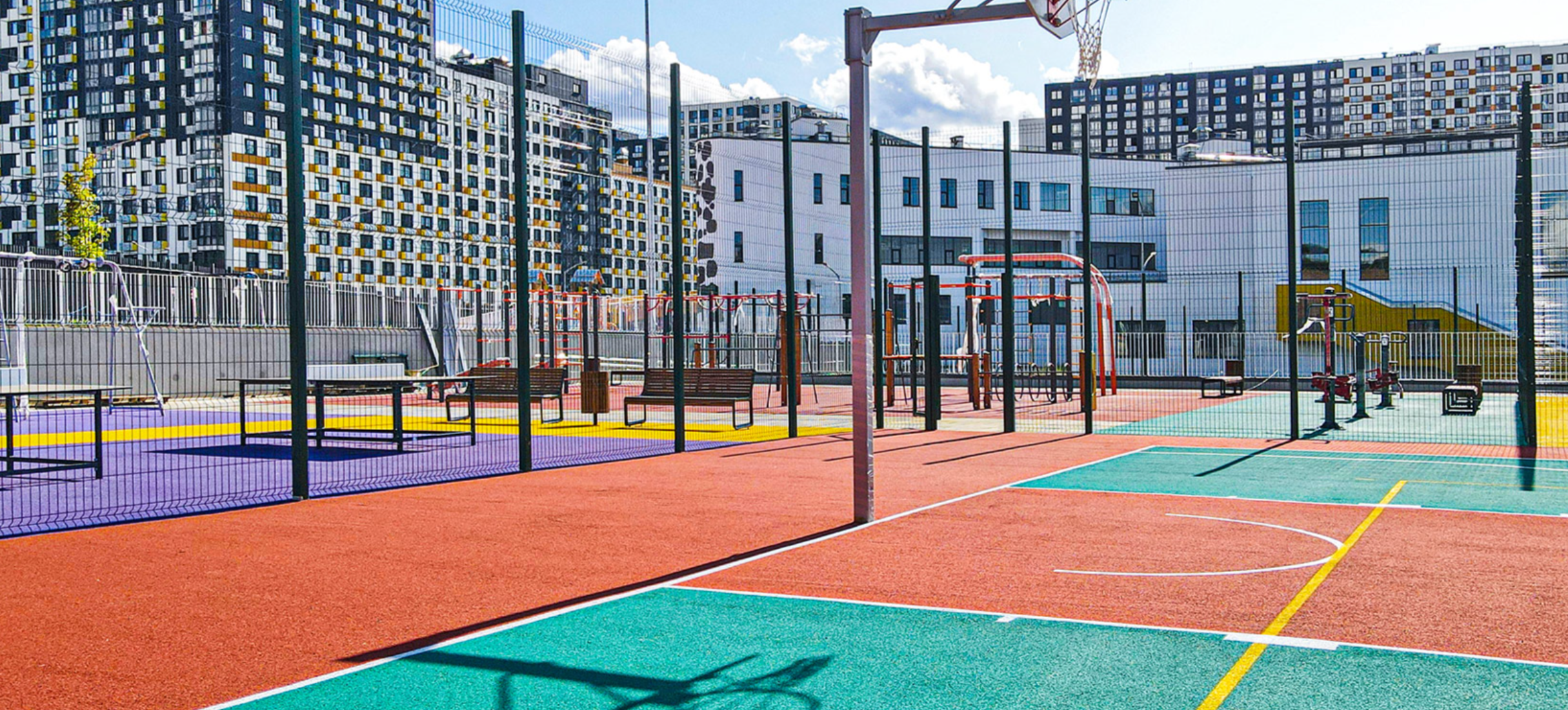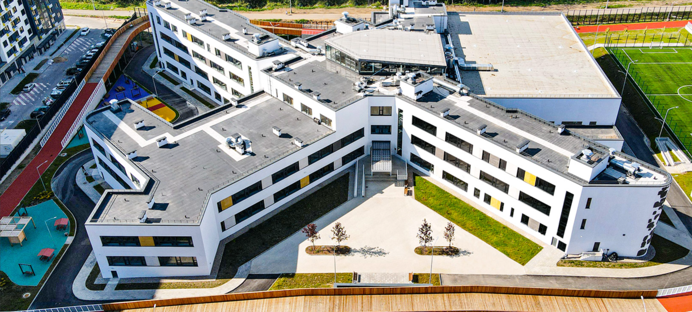 Проект отличается развитой инфраструктурой. Ее центральный объект - общеобразовательная школа со спортивным уклоном, рассчитанная на 1125 учеников. Внутри здания располагаются гимнастический зал, спортивный зал с трибуной на 600 мест и два бассейна. Рядом построен детский сад для 225 малышей. На первых этажах домов разместились супермаркеты, магазины, кафе, пекарни, аптеки, салоны красоты, пункты выдачи заказов. Для автомобилей предусмотрены подземные паркинги.