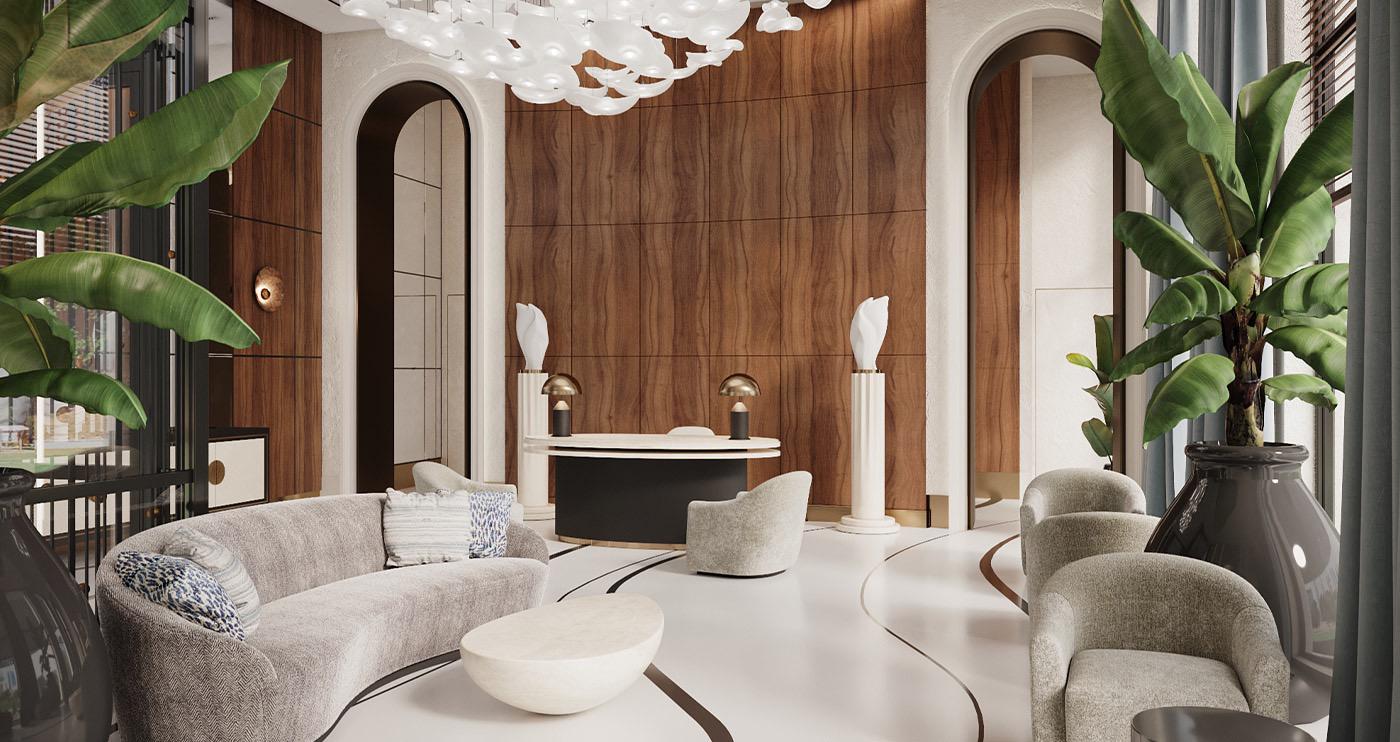Архитектурное решение от бюро ADM поражает своей изысканностью, при этом оставаясь сдержанным. На первом этаже располагается просторное лобби с интерьером, созданным Лейлой Улуханли.