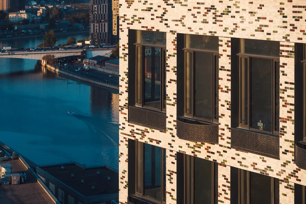 Дома расширяются снизу вверх — это увеличивает площадь апартаментов на высоких этажах и придает проекту узнаваемый вид. «Воздушные» здания стали доминантой района. А эффектная подсветка фасада выИз увеличенных окон апартаментов открываются завораживающие виды на город и Москву-реку. Окна последних этажей увеличены, чтобы ничто не мешало любоваться панорамой Москвы в свете солнца или россыпи ночных огней. деляет комплекс и подчеркивает индивидуальность архитектурных решений.
