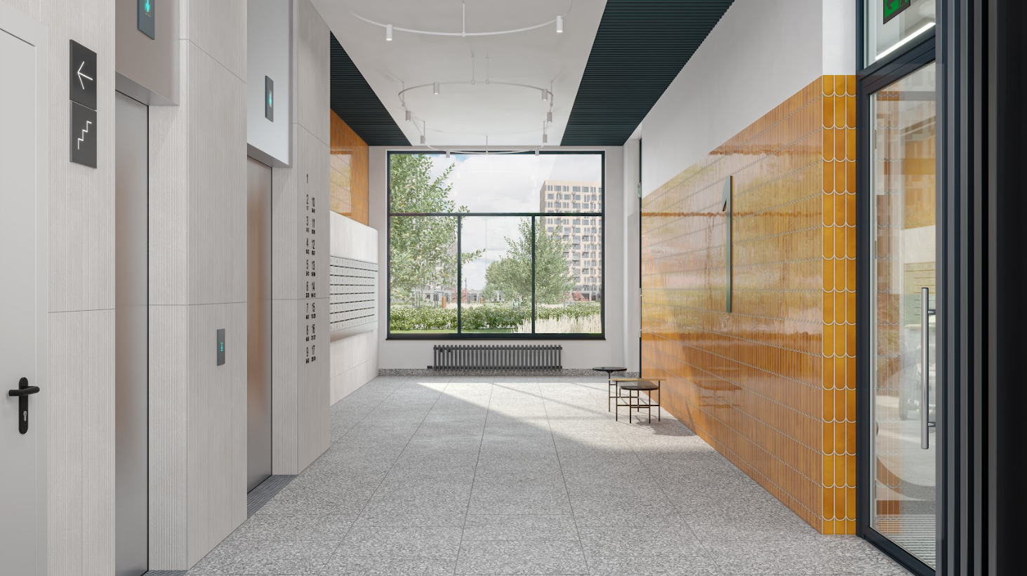 Интерьеры в лобби гармонируют с архитектурой и продолжают тему вдохновения природой. Стены выполнены в серых оттенках — похоже на оперение птиц Подмосковья. А насыщенный желтый оттенок плитки в сочетании с темными деталями интерьера добавляет изюминки в интерьер и делает его более современным и стильным.