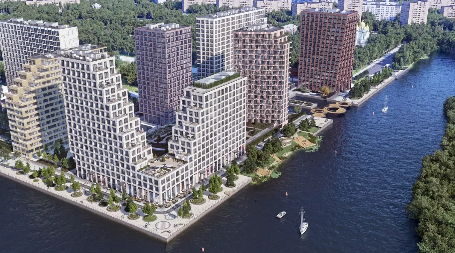 Архитектура корпусов максимально использует расположение их у самой кромки воды, раскрывая огромные окна для любования небом, солнцем и водой, а многочисленные террасы уступами спускаются к набережным. Вода буквально входит внутрь жилого комплекса затоном, а пирсы выдвигаются навстречу волнам, позволяя вам остаться один на один с рекой. Длинные извилистые дорожки уступами спускаются от домов к воде, петляя между большими деревьями.