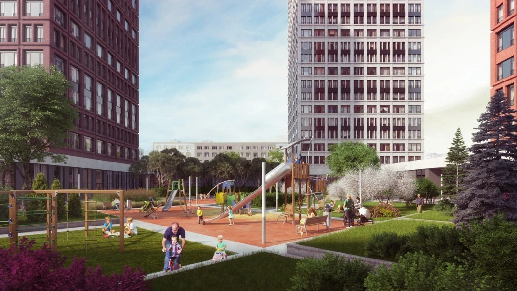 Четыре жилых здания высотой, объединенные общим стилобатом, образуют уютный закрытый внутренний двор. Это идеальное место для спокойного отдыха, позволяющее жителям укрыться от городской суеты и подарить детям безопасное пространство для игр.