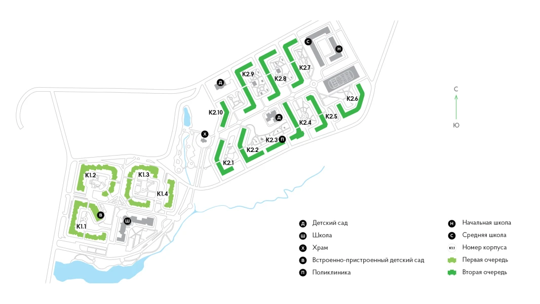 Инфраструктура комплекса органично включает три детских сада и две школы, а также предусмотрено здание для поликлиники и других объектов социально-культурного назначения. Здесь был создан уникальный пешеходный бульвар, который привлекает внимание. Рядом с первым корпусом раскинулся живописный пруд, ставший излюбленным местом отдыха. Кроме того, детские площадки и спортивные зоны занимают значительное пространство, создавая комфортные условия для жителей.